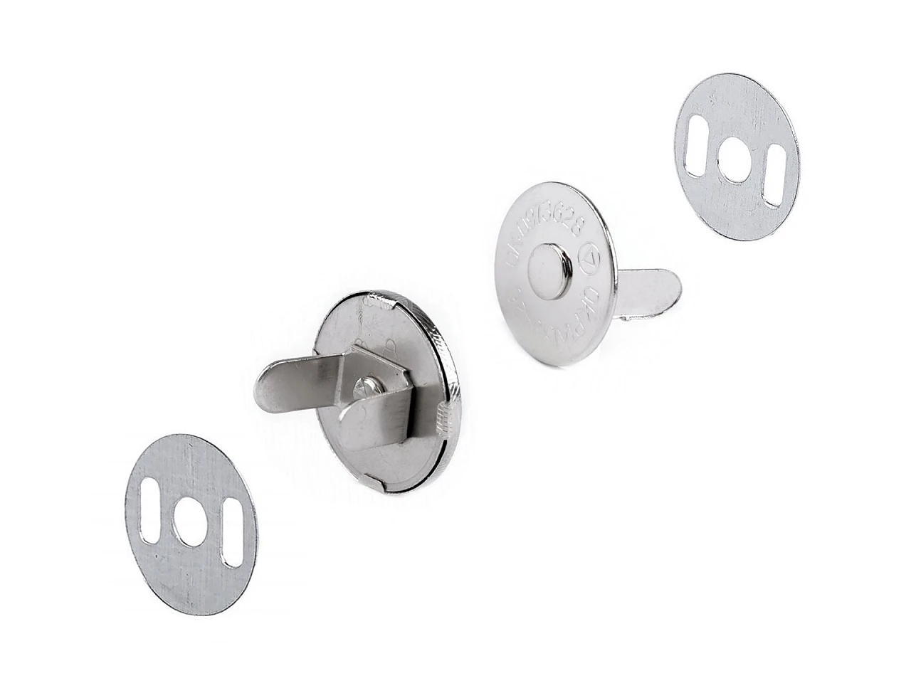 Tanjša magnetna zapirala s posebej močnim magnetom. Primerni kot zapenjanje za močnejše tkanine. Na primer: jakne, plašči ali jopice,... Primerni tudi kot magnetno zapiralo za torbice. Lahko ga prišijete tudi na vrečke.   Debelina spodnjega dela: 2,5 mm. Premer: 18 mm Sestava: magnetna kovina